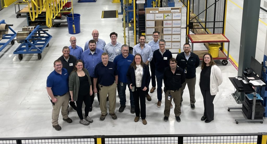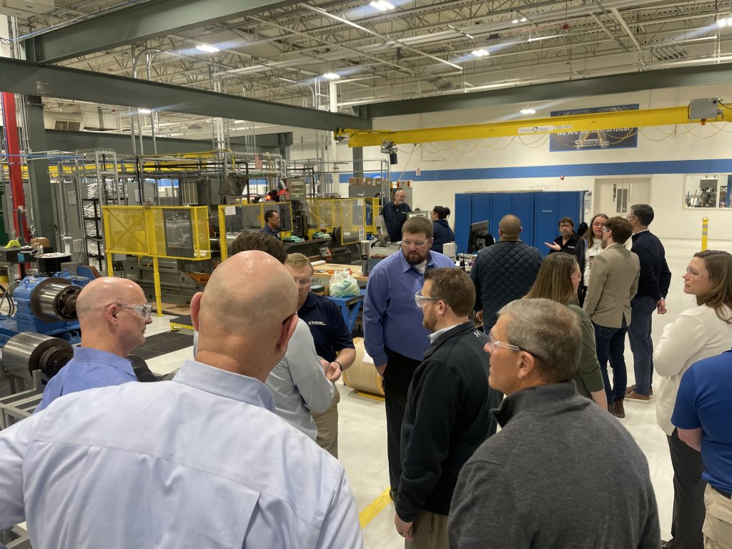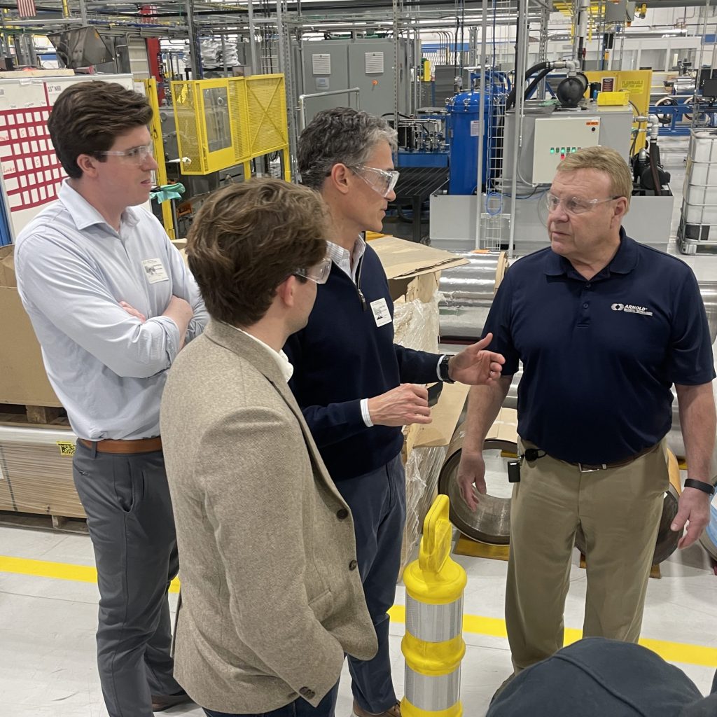 The group stops to learn about Arnold’s rich 130 year history illustrated on this new mural in Arnold’s new Woodstock, IL facility. CODI acquired Arnold in 2012 and has provided steady leadership and considerable ongoing investment to help Arnold grow substantially in the last 14 years. Moving the PTM and Alnico operations from Marengo, IL to Woodstock was the largest project they have supported to date.