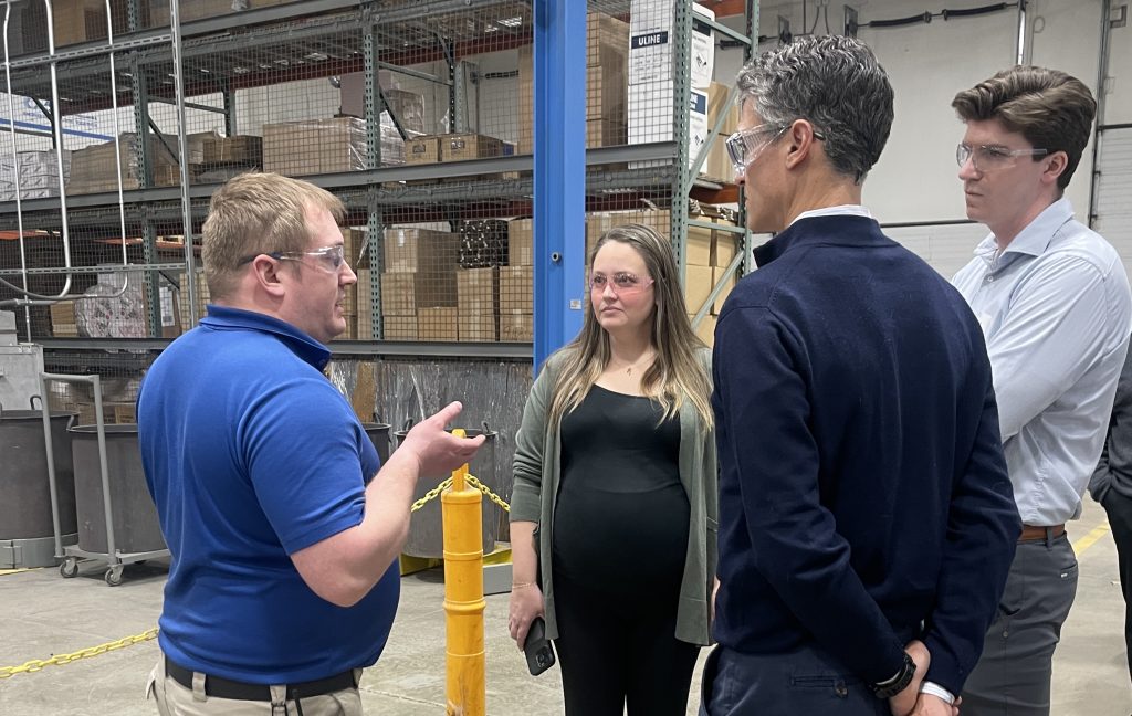 Engineering Manager Ross Mahoney and Production Manager Meagan Jones led the tour through the Alnico section of the plant, shown here talking with Ryan Thorpe and Devin McNulty from CODI.